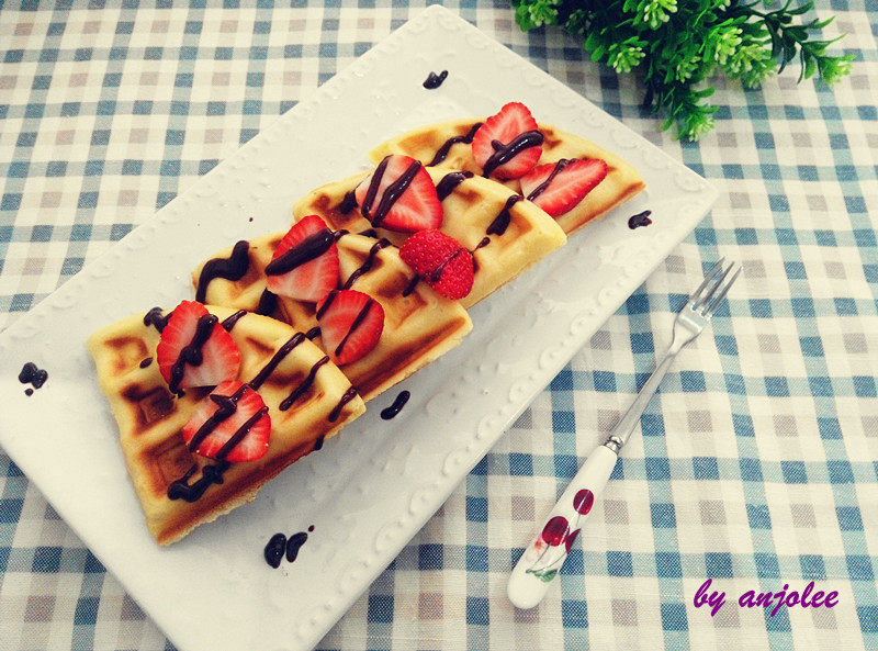 14:取出华夫饼,淋上巧克力酱,放上水果,冰激凌。