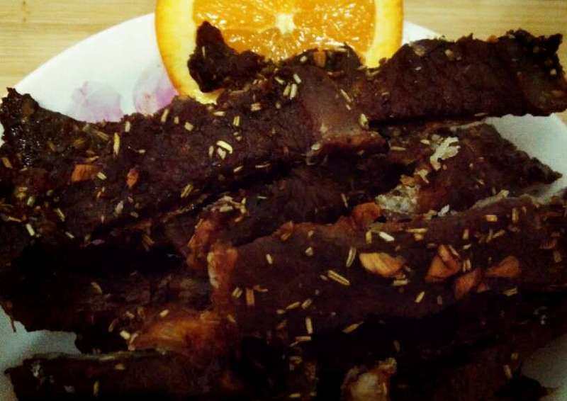 牛肉条的腌制入味过程必不可少,让橙汁和迷迭香的味道侵入肉中。