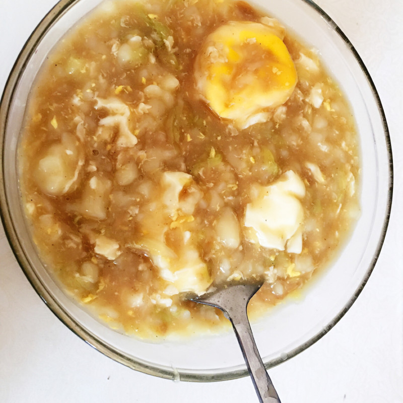 5:在用盆拌疙瘩,忘记拍照了,锅开在加入一个鸡蛋,快速搅散。