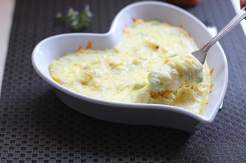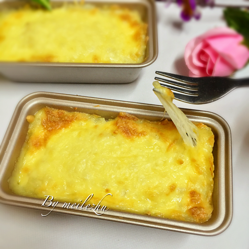 14:放进烤箱中层,上下火165度,20分钟,芝士融化并且表面稍微焦黄即可