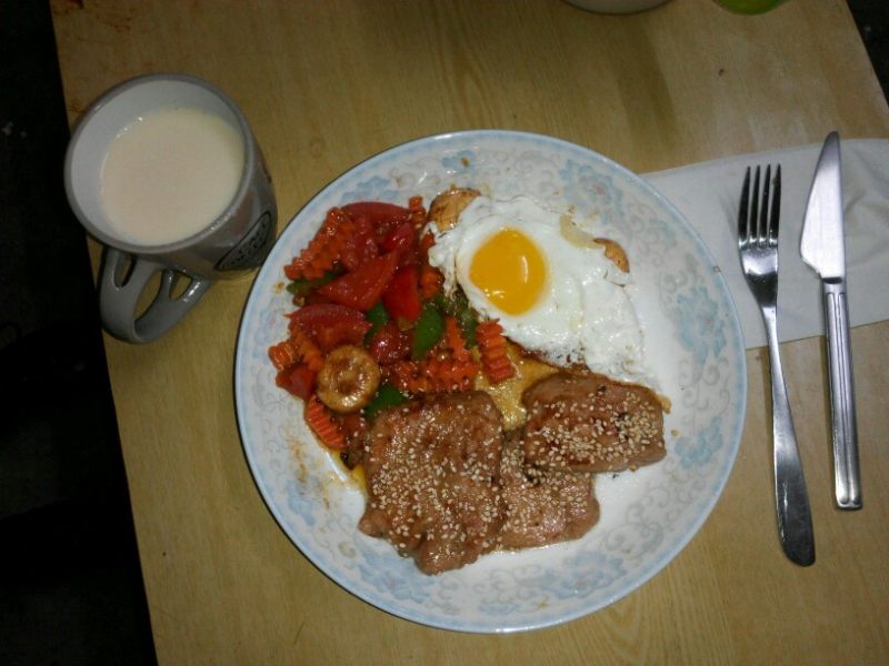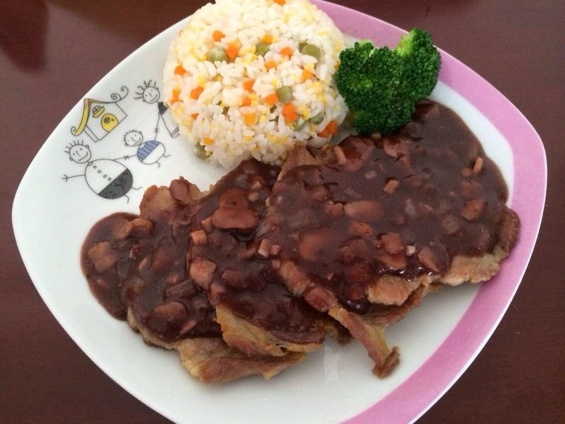 10:盛好米饭(其实白饭就可以了。我是想把早上剩下的玉米消化掉,所以炒了饭)铺上猪扒和烫熟的任意蔬菜,淋黑椒汁。