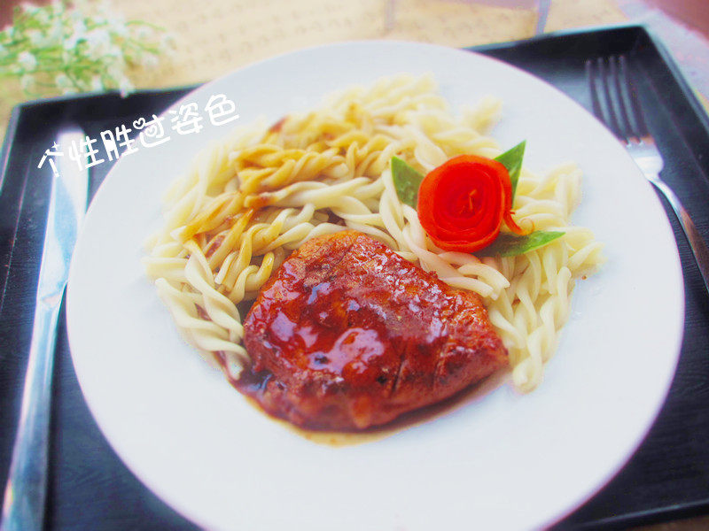 10:进行摆盘,猪排通心粉放入盘中浇上做好的黑胡椒汁