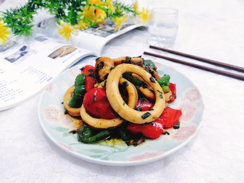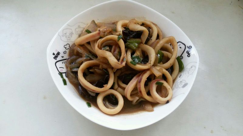 1:先将鱿鱼圈表层黑皮撕干净,然后洗干净沥水。洋葱切成丝,木耳撕小朵,青椒切小快。
