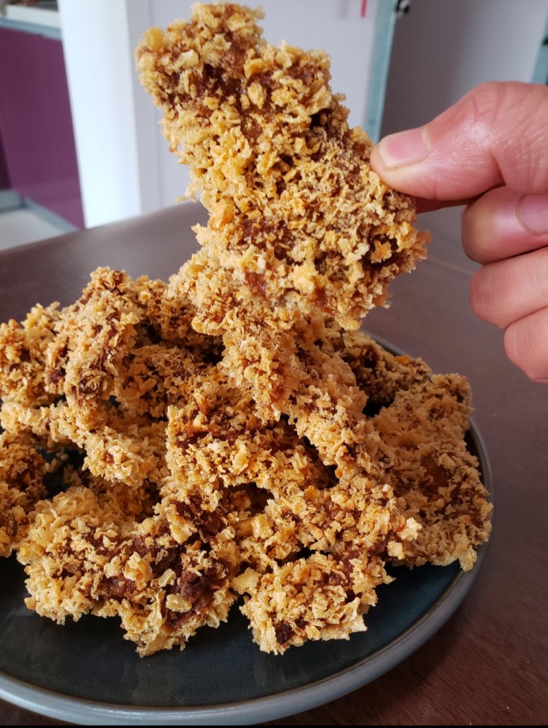 5:肉片放到面包糠上,裹均匀,裹好面包糠的肉片,备用。