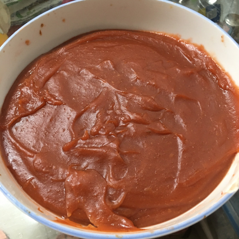 6:~烤箱预热一百度~烤盘上铺上油纸~均匀的铺上山楂酱~刮平~入烤箱~上下一百度~四十分钟左右~