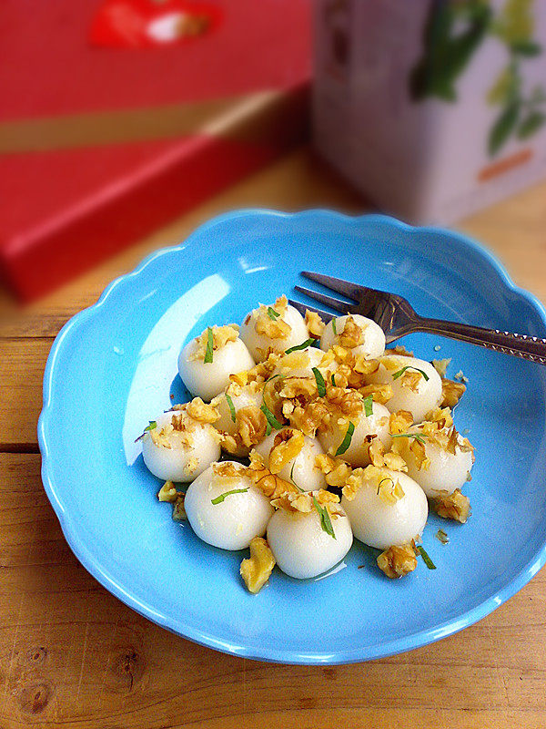 1:核桃研碎,糯米粉与粘米粉加水揉成圆子,薄荷叶剪碎