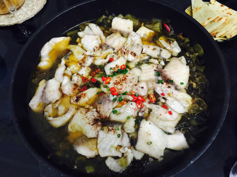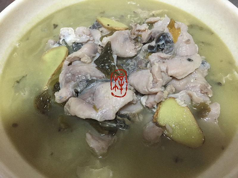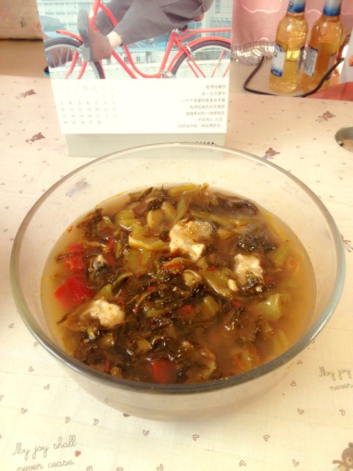 6:尽量盛出锅内所有的鱼头鱼骨,留汤,放入剩下的酸菜、鱼片煮大概不到一分钟,出锅。