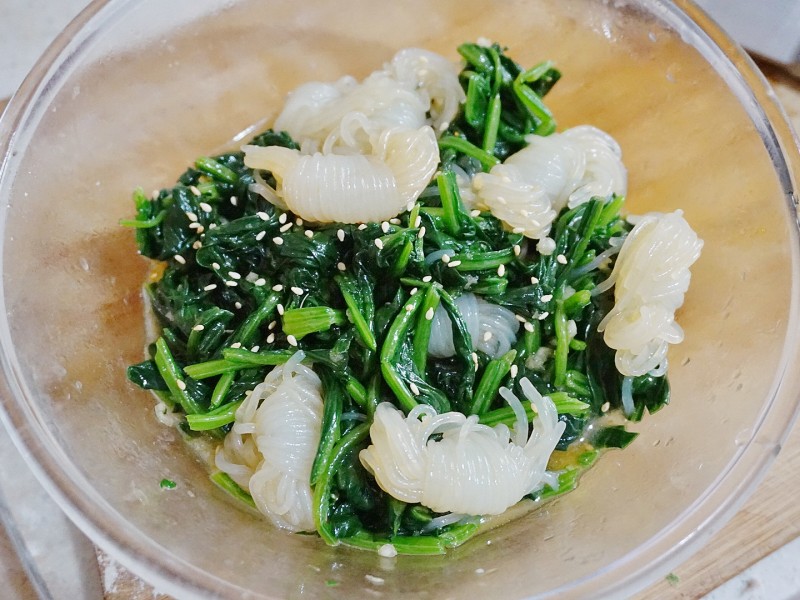 2:绿豆芽焯水,绿豆芽变透明捞出过凉水,用手挤干水分。