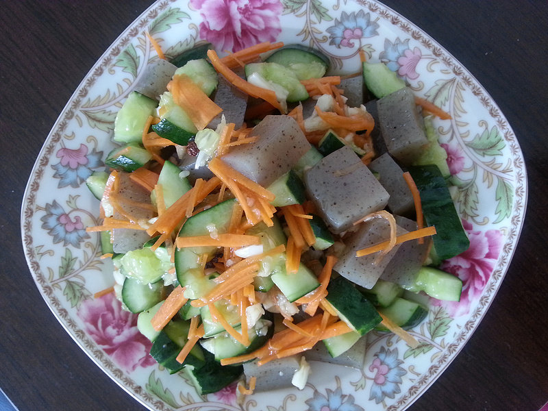魔芋很筋道,没有什么味,所以要加够生抽、醋等调料。黄瓜拍裂即可,不要拍得太碎,与魔芋大小一样的块状就可以了。