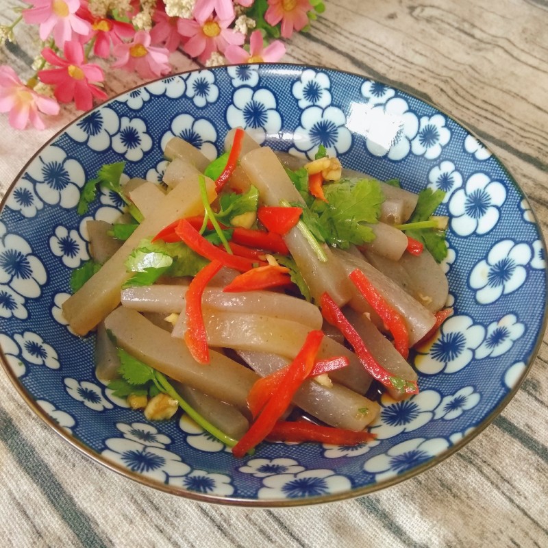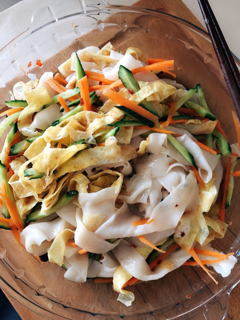 1:买的是怡力的即食魔芋凉皮,不用煮,但是要凉水多冲几遍,把泡凉皮的碱水味儿冲掉。