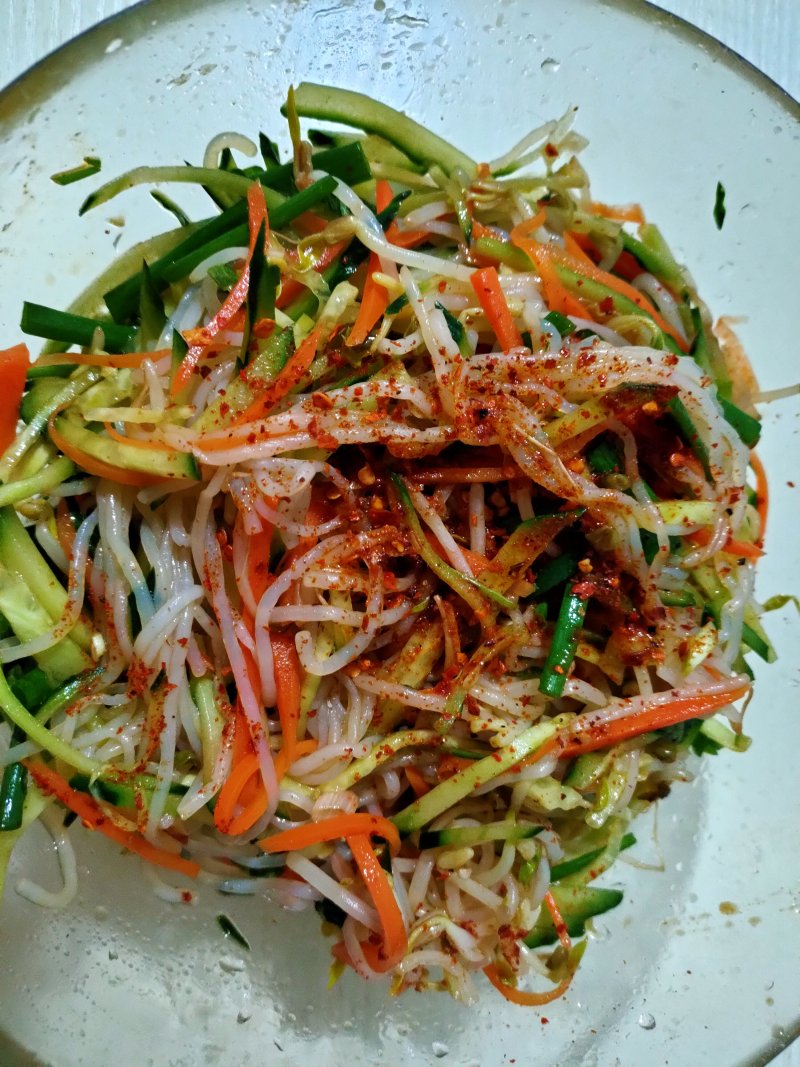 黄瓜1根;胡萝卜1根;豆芽250g;魔芋丝1包;