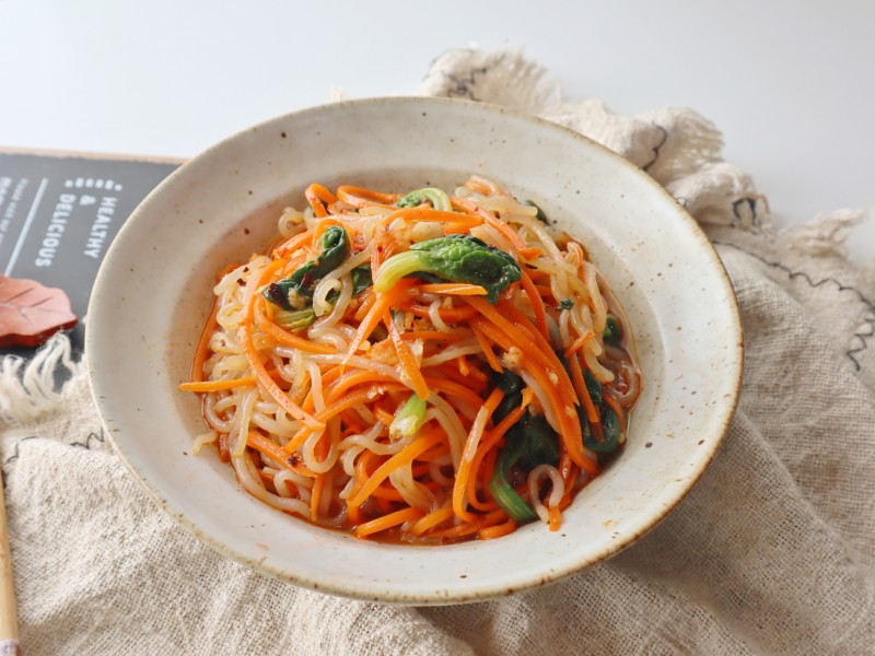 9:魔芋粉丝热量极低,胡萝卜和菠菜富含大量膳食纤维,有助于消化代谢。