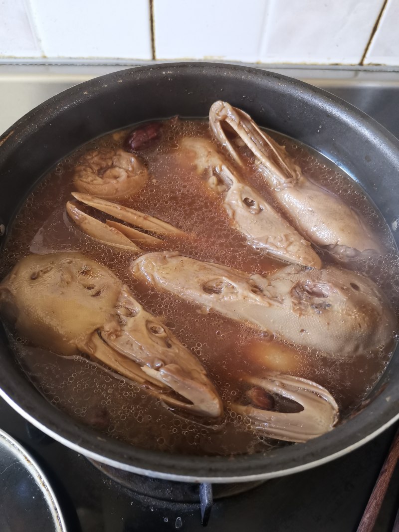 4:待香料的味道煮出来后放入鸭头煮开。