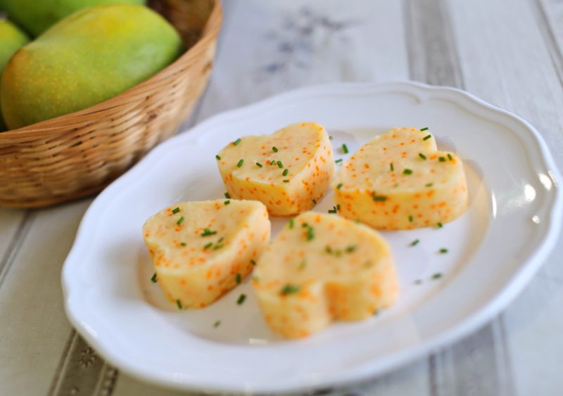 2:压碎土豆泥拌入1汤勺鲜奶油(没有用牛奶也可以),适量沙拉酱,胡椒粉和盐调味。等到土豆泥完全摊凉后加半勺鱼籽(生吃专用的鱼籽),搅拌均匀