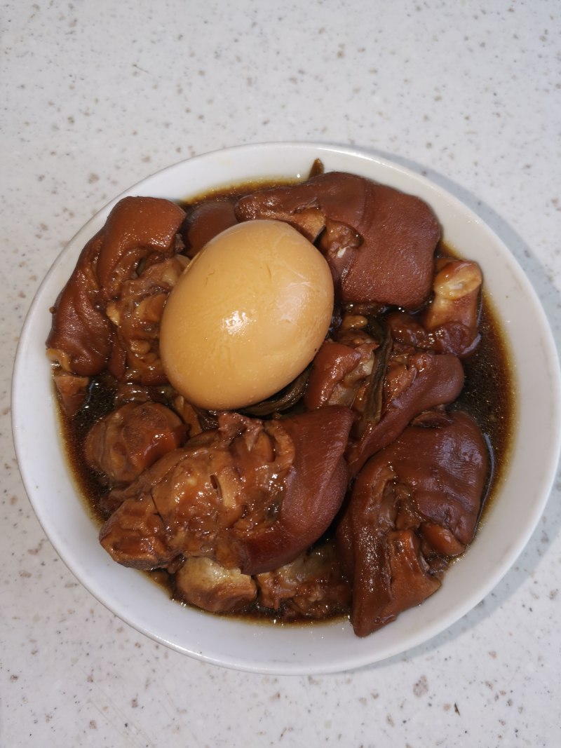 5:猪蹄放入高压锅,加葱姜,干红辣椒,香料,生抽,老抽,料酒,加水没过猪蹄,炖1.5小时。