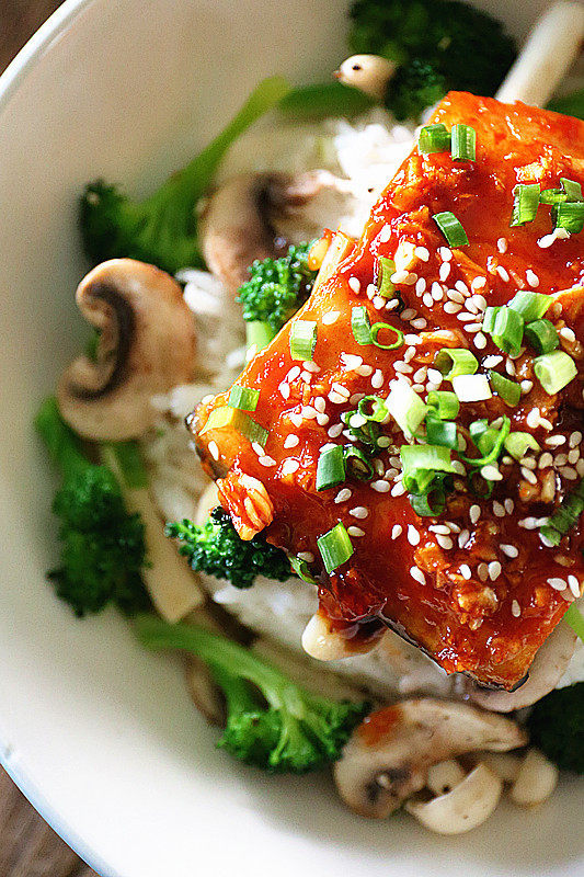 8:将烤好的鱼排放在鲜蔬饭上,撒上芝麻和葱末就完成了。