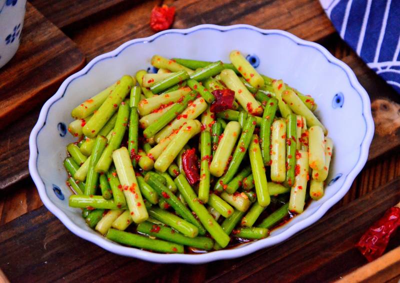 1:蒜苔洗干净控干水份,切断,用盐腌制两个小时,折起来有韧劲不断就好了。