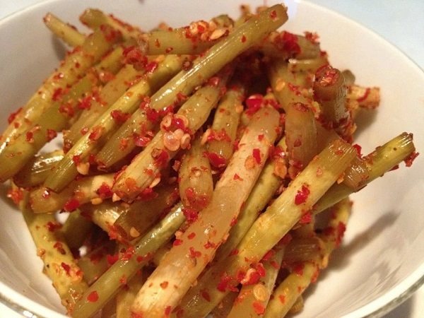 13:把蒜薹段盛到无油无生水的容器里,撒精盐。