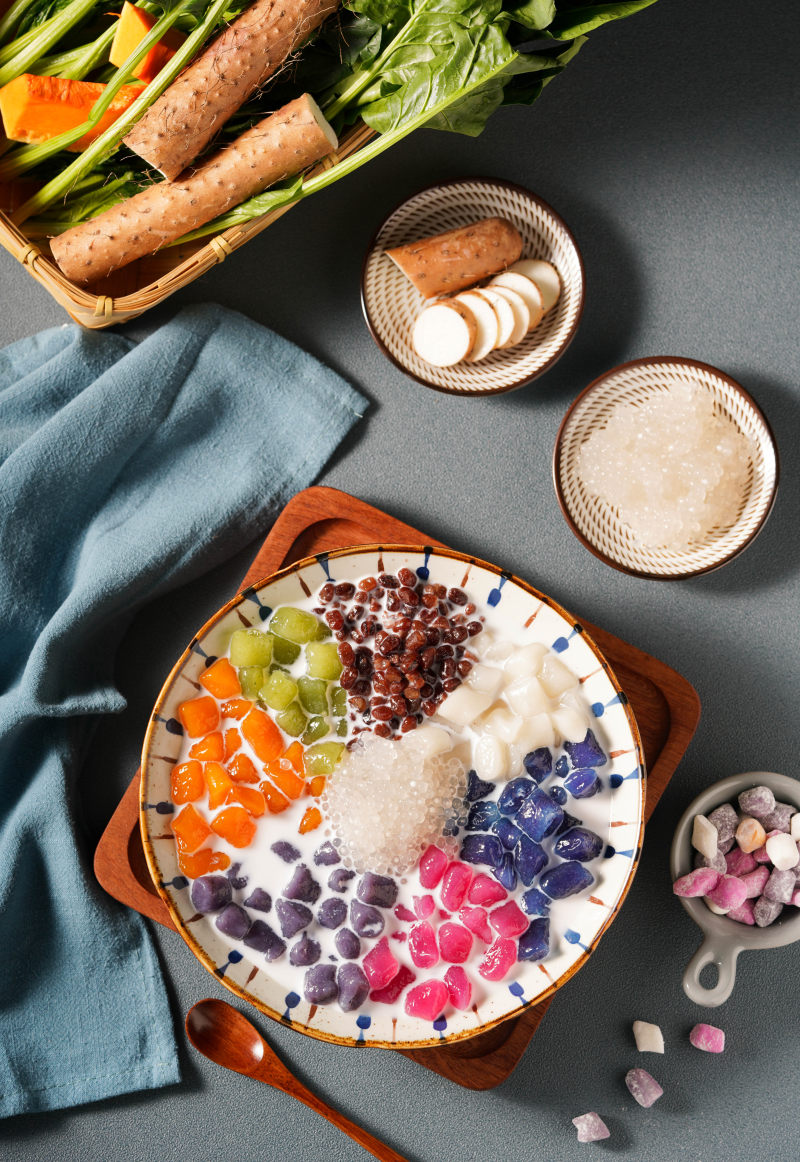 芋头150g;黄心番薯100g;细砂糖适量;蜜豆20g;木薯粉210g;椰浆粉50g;