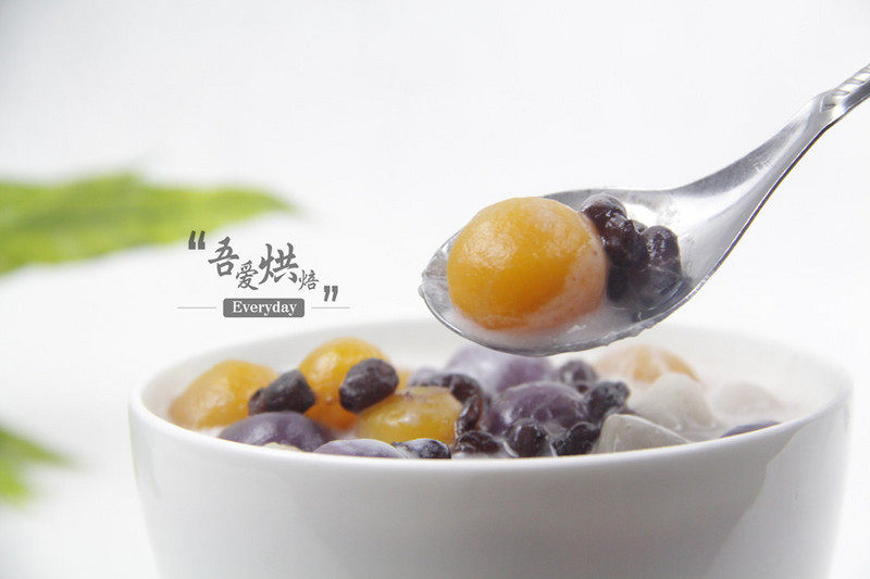 8:里装上芋圆,再加入调好的椰浆粉,表面放上蜜豆即可