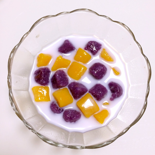 8:将煮好的芋圆捞出放入冷藏的椰奶中,这样芋圆Q弹,很美味哦~