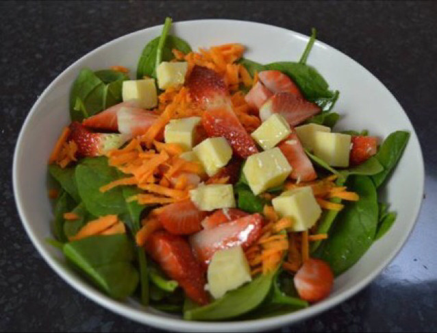 1:草莓洗干净切块,胡萝卜切丝,芝士切块
