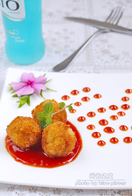 1.鸡肉建议用鸡腿肉,这次用鸡胸肉感觉口感略干。2.炸肉丸时逐个裹好面包糠,再逐个下入油中。