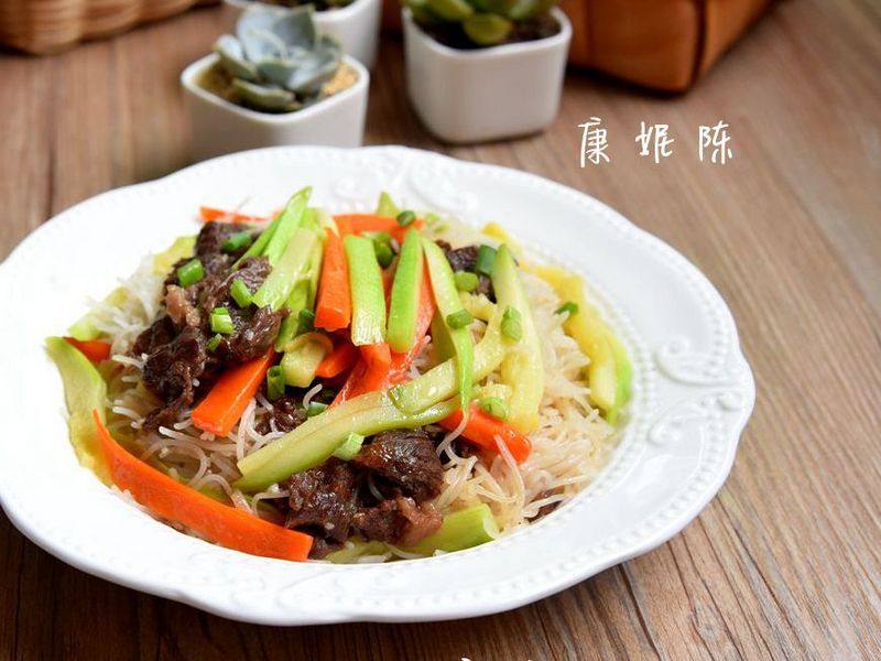 7:把米粉、牛肉和蔬菜都炒熟撒上葱粒即可