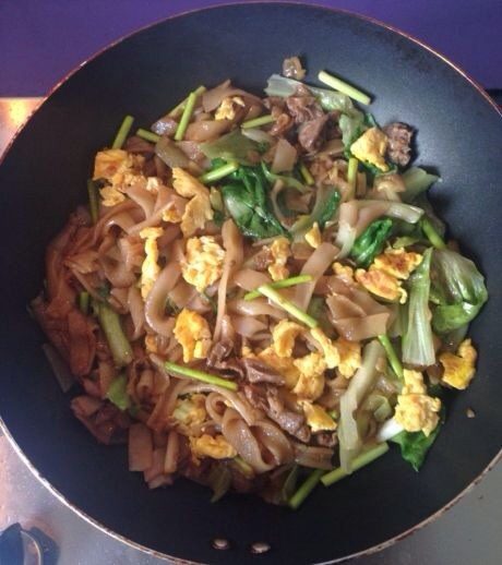 7:不粘锅放油,把米粉放入,加盐,老抽翻炒几下放入蒜台翻炒,放炒好的牛肉,鸡蛋,生菜,翻炒几下放鸡精(根据个人口味放鸡精,可放可不放)
