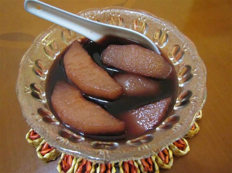2:把雪梨去皮,去核。倒入奶锅中,酒最好没过雪梨。
