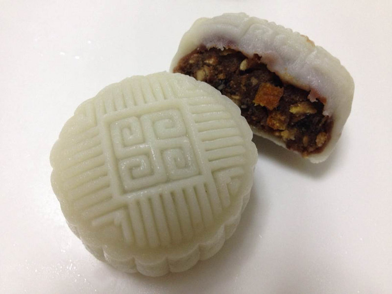 11:把冰皮和馅料各自分成25克的小团,把馅料用冰皮裹起来揉成团,用事先炒好的干粉轻轻一裹,用模具卡出来即可。把月饼放入冰箱冷冻至少2小时,再回温半小时,就能吃到一份完美的冰皮坚果月饼了。
