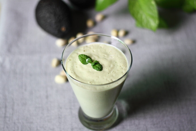 3:将夏威夷果、开心果、去皮的香蕉和牛油果一起放破壁机杯中