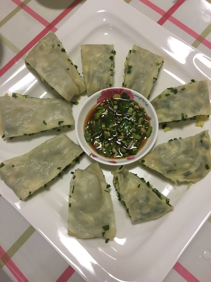 2:将韭菜洗净切碎,鸡蛋炒熟切碎,加入适量的盐和芝麻油拌匀。再将面杆成饺子皮一样的厚度,把菜洒在面皮上皮,并卷起