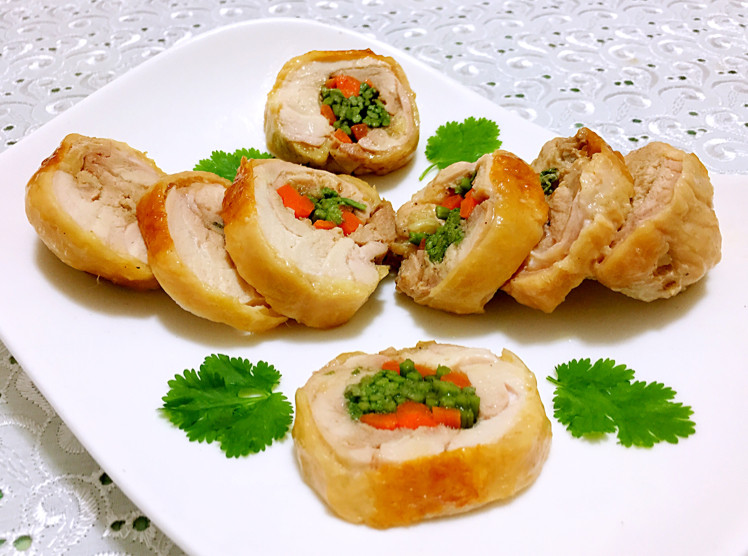 6:将蔬菜和鸡蛋皮放入千张中,从一边卷起来。