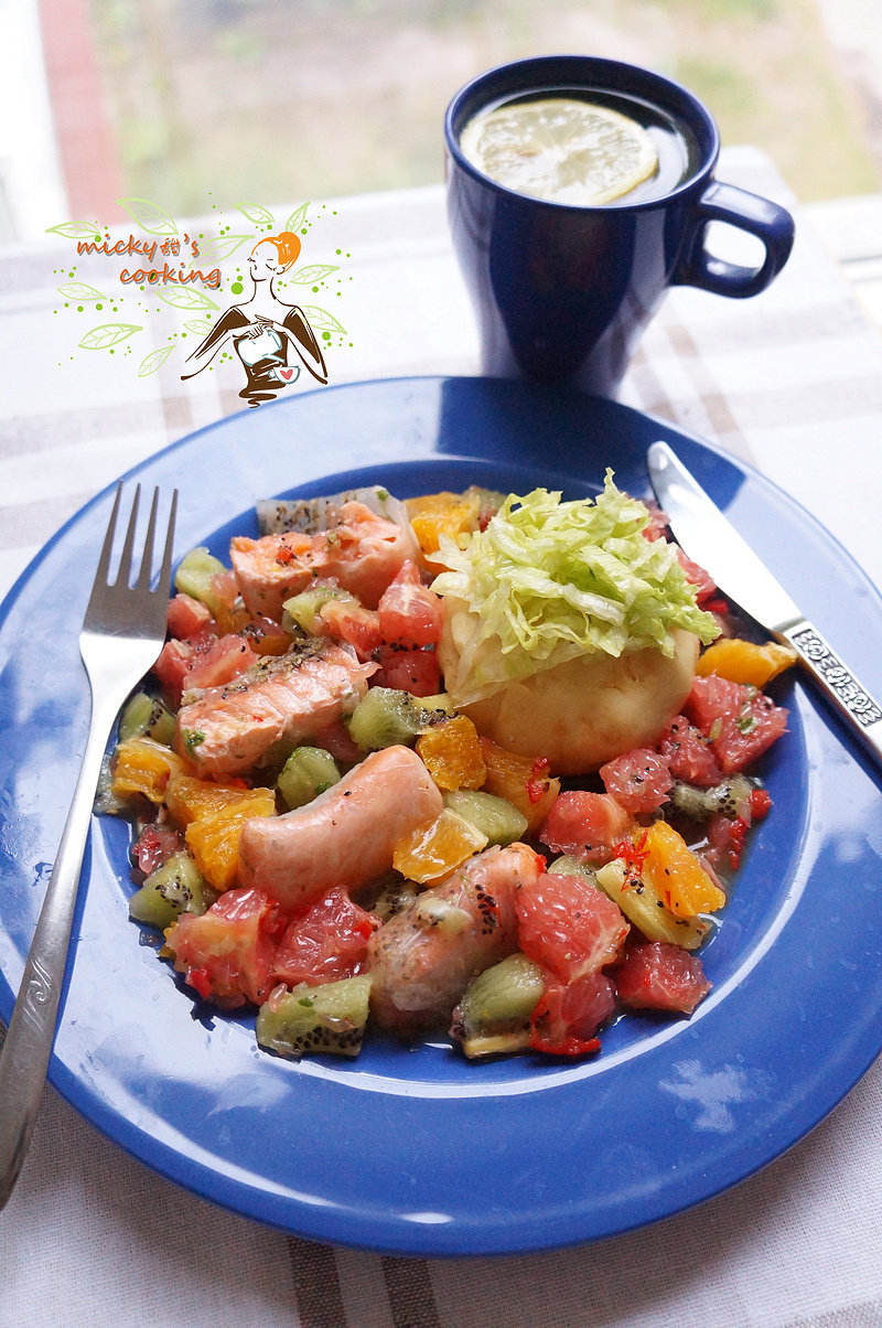 7:取鲑鱼卷切成块后与土豆泥、水果色拉、适量豆芽菜组盘即可