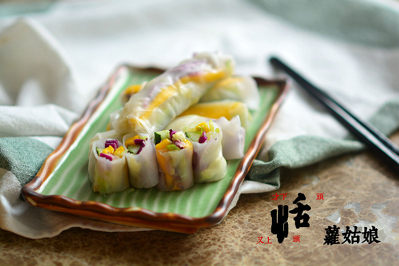 2:将鲑鱼撒上适量盐、黑胡椒、巴西里碎用米纸卷成一卷(需用餐巾纸吸去多余水份)
