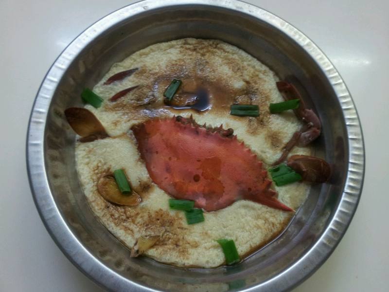 7:上锅蒸,蒸好后撒葱花再倒点酱油,完工。好吃的芙蓉蒸蟹就做好了。