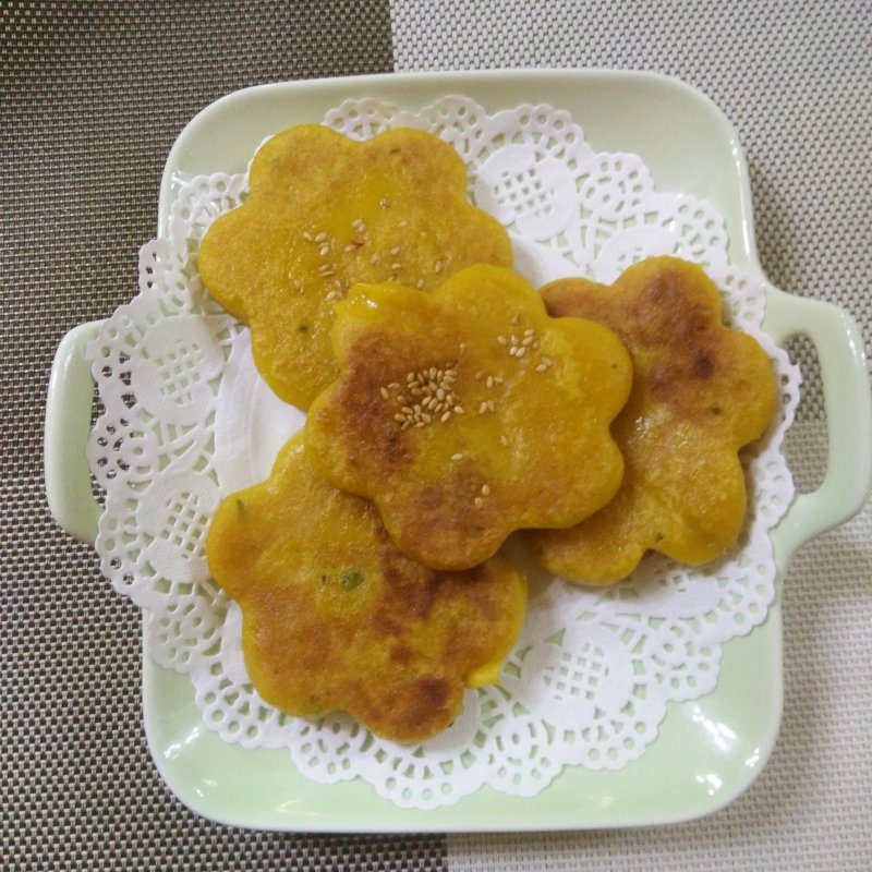 3:平底锅或者电饼铛加热,放入少许色拉油,油温5层热,放入做好的南瓜饼,少许水,盖上锅盖5分钟左右,饼已煎熟,翻过来再轻煎一下即可。