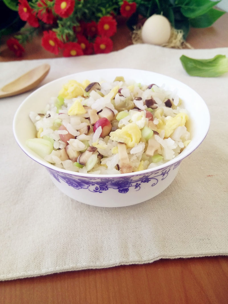 米饭100g;莲藕100g;榨菜30g;香菇5朵;鸡蛋1个;