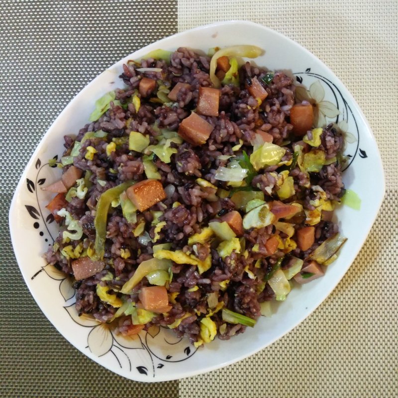 黑米饭一碗;火腿肠1根;葱花一些;圆白菜一些;鸡蛋一个;榨菜一包;