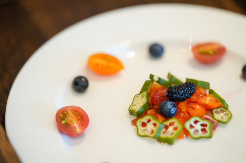 秋葵适量;蓝莓适量;桑椹适量;圣女果适量;蓝莓果醋适量;