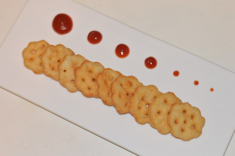 4:锅中加油,炸至金黄色捞出,配上番茄酱……