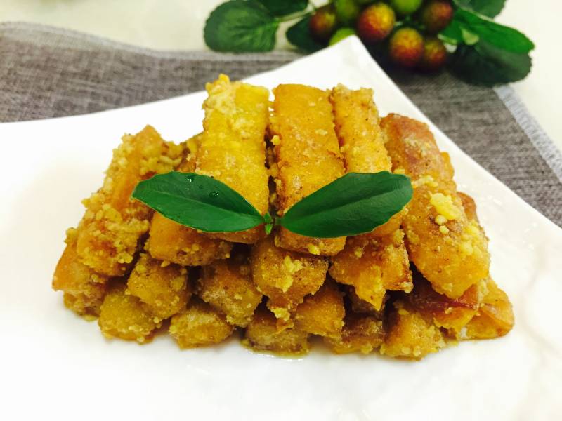 10:加入南瓜翻炒均匀,每一条都裹上咸蛋黄即可。