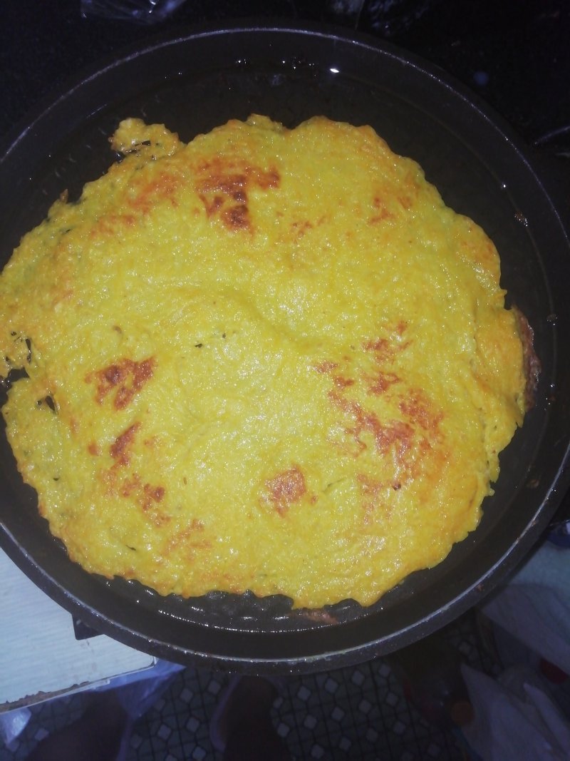5:电饼铛倒油刷匀就行,导入一半的面糊摊平