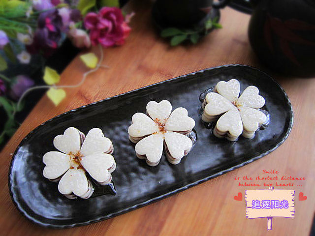 8:切好心形年糕片中夹入豆沙,放锅中蒸软拿出浇入桂花蜜即可