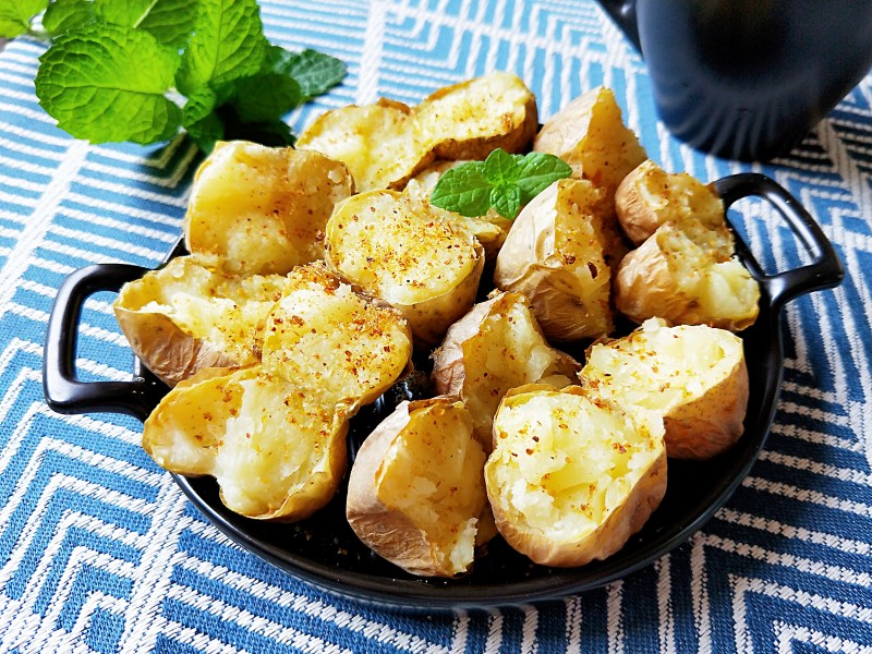5:成品。掰开两半,撒上椒盐粉即可,粉粉糯糯,格外好吃。