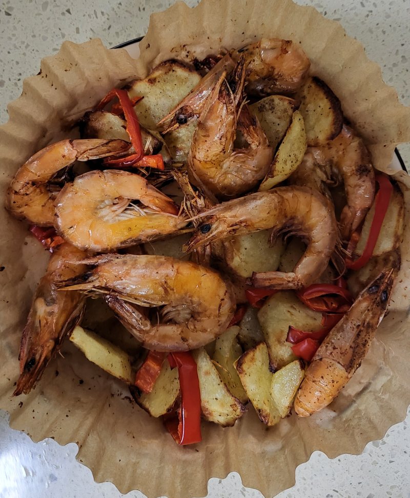 5:15min后,放入切的彩椒丝,根据土豆水分情况,空气炸锅200度再来5-8min。
