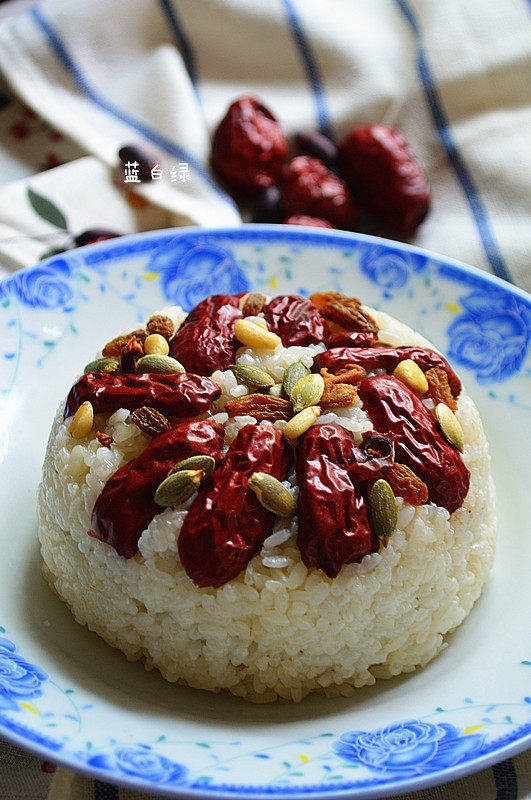 4:碗里按造型摆入红枣,葡萄干、松仁、瓜子仁、枸杞等果仁