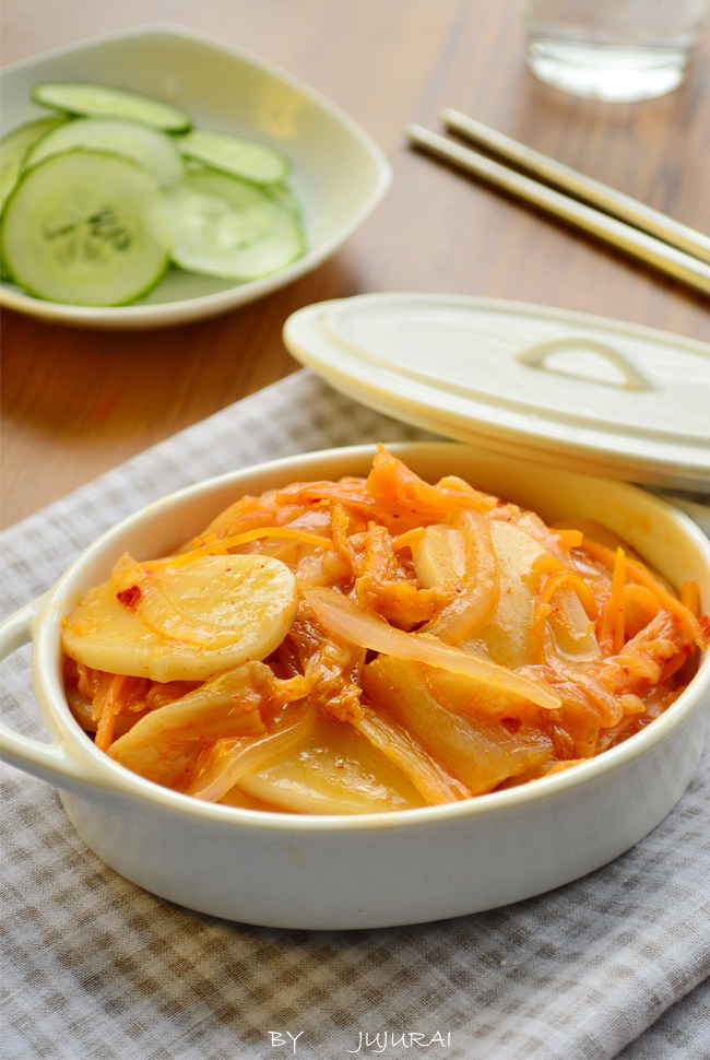 5:辣白菜半棵,叶片间布满了甜辣汤。
