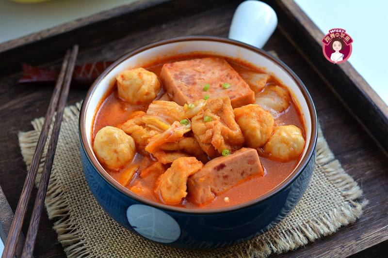 韩式辣白菜半棵;油豆腐1碗;午餐肉1盒;杏鲍菇2根;扇贝丸1碗;